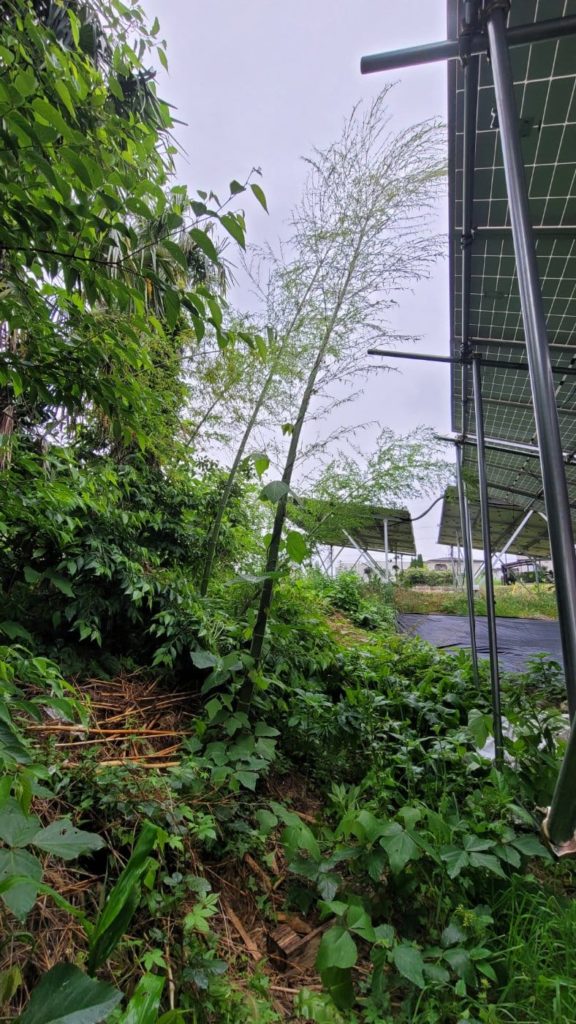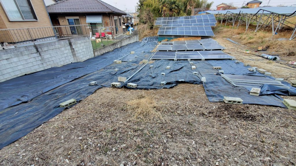 写真のように除草と防草シート敷設を行いました。防草シートのピンの間にかなりきつく張った糸を通すことにより、風に対する抗力がかなり上がるとみております。全作業が完了していないので、後日継続します。