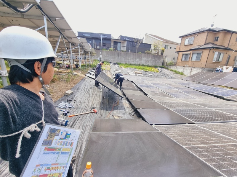 レイアウト変更とパネルの追加作業を行いました。周辺の建築物の影にかかることが多いのですが、高い過積載率とピークカットの時間を分散させることで、高い収益性を狙います。